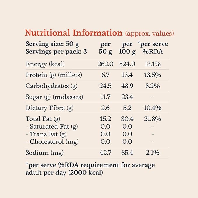 Per 50g; Energy 262 Kcal; Protein - 6.7g; Fat - 15.2g; Sugar - 11.7g