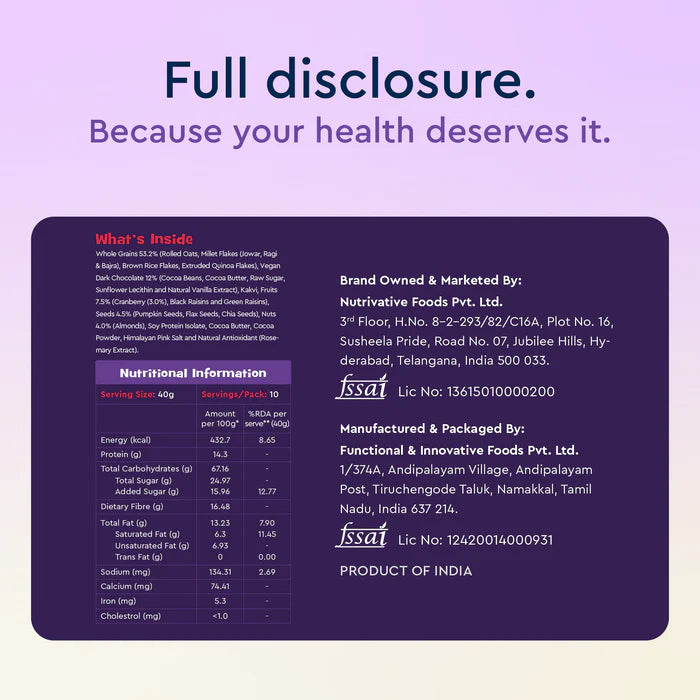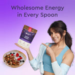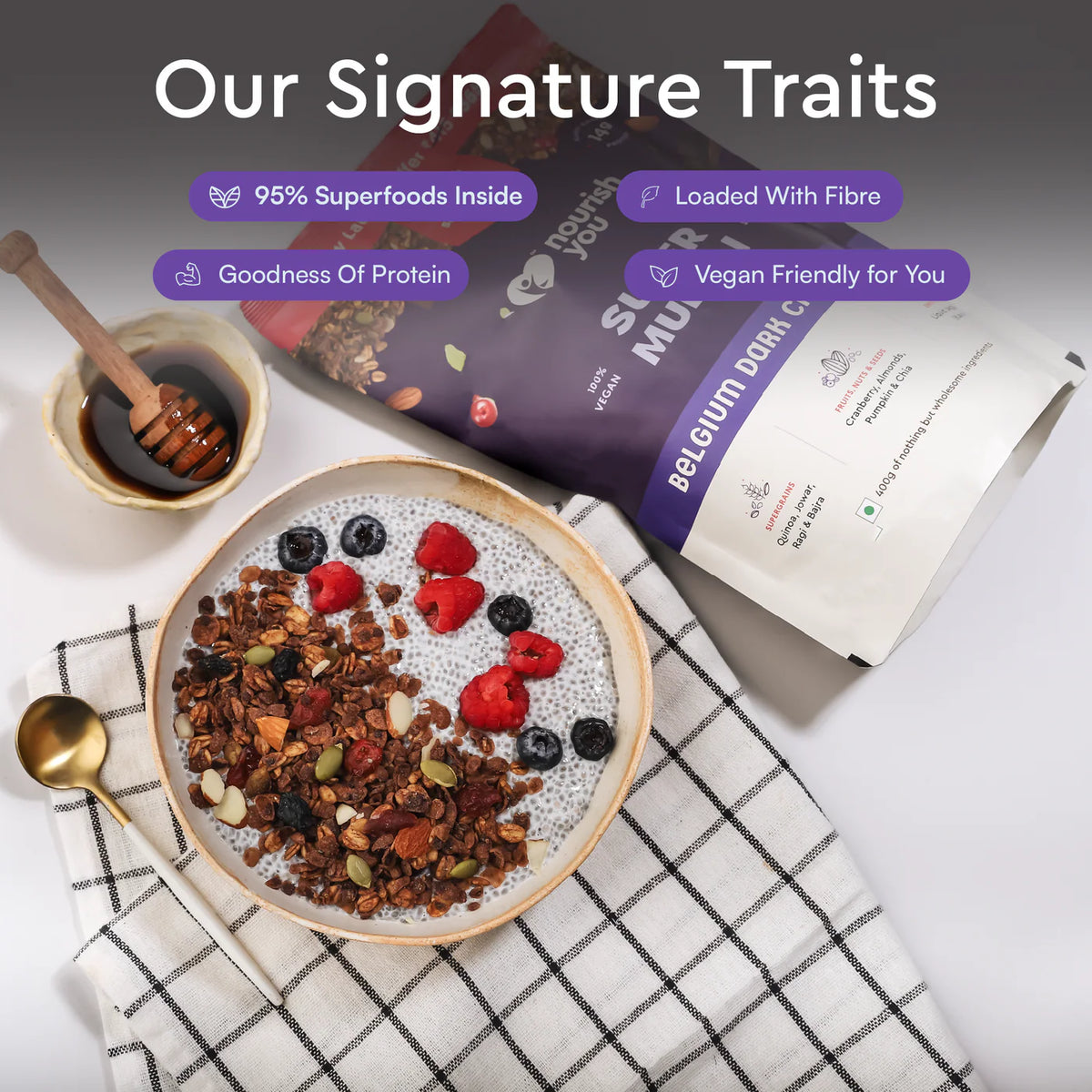 Indulge in Nourish You's homegrown Belgium dark chocolate muesli, a plant-based, gluten-free, homegrown millet blend (ragi, jowar, bajra) delight crafted for health-conscious foodies. Made with rich dark chocolate harvested from the lush cocoa plantations of Andhra Pradesh, this muesli delivers an authentic and wholesome experience. With no refined sugar or preservatives, it’s a guilt-free way to satisfy your cravings. Packed with 14g of protein per 100g serving, it fuels your body while supporting muscle health. This perfect blend of indulgent dark chocolate and crunchy goodness offers a nourishing and delicious start to your day or an anytime snack!