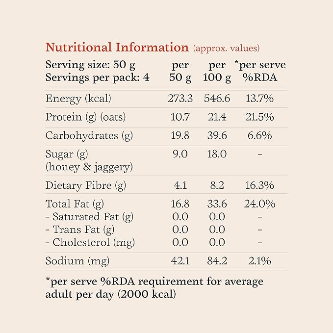 • Per 50g; Energy 273.3 Kcal; Protein - 10.7g; Fat - 16.8g; Sugar - 9g