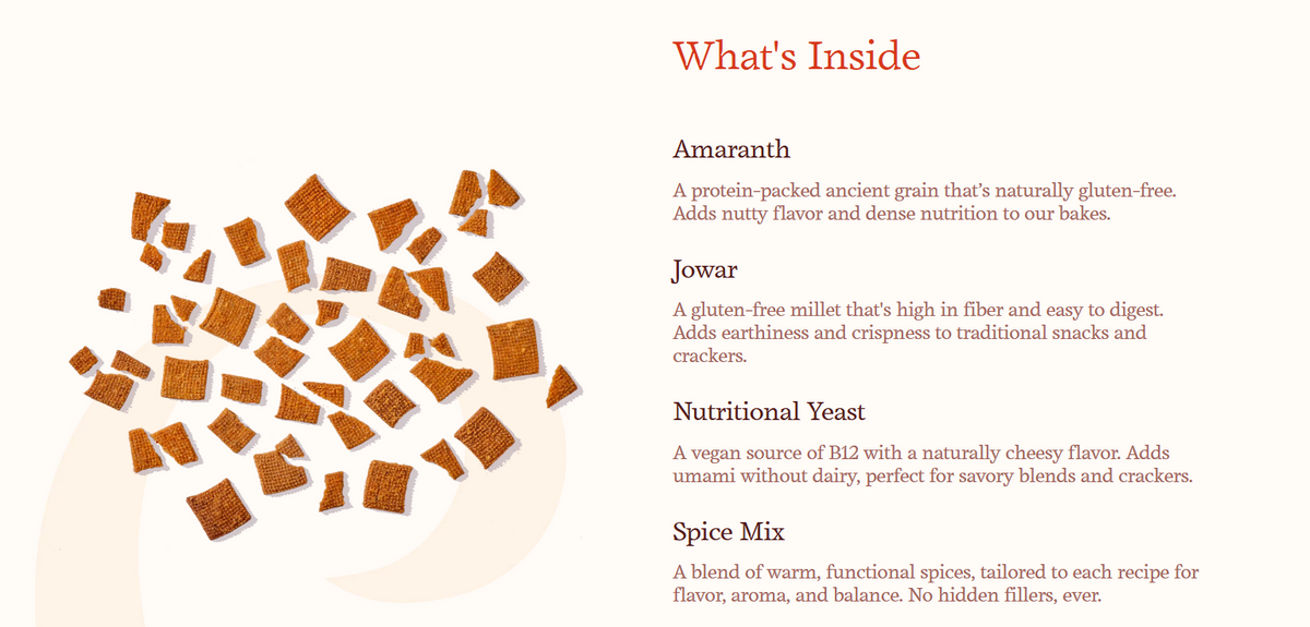Amaranth & Jowar Millet Flour Mix (74%), Olive Oil, Nutritional Yeast (4%), Oregano, Dehydrated Onion, Dehydrated Garlic, Pink Salt, Baking Soda, Nutmeg