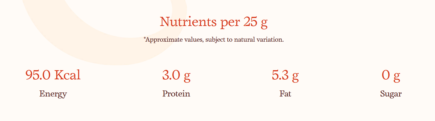 • Per 25g; Energy 95 Kcal; Protein - 3g; Fat - 5.3g; Sugar - 0g